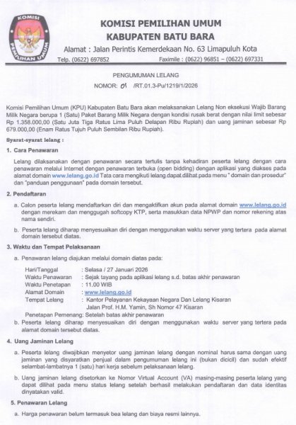 #TemanPemilih Berikut kami umumkan Pengumuman Nomor: 01/RT.01.3-Pu/1219/1/2026. Komisi Pemilihan Umum (KPU) Kabupaten Batu Bara akan melaksanakan Lelang Non Eksekusi Wajib Barang Milik Negara Berupa 1 (satu) Paket Barang Milik Negara dengan Kondisi Rusak Berat dengan Nilai Limit Sebesar Rp 1.358.000, 00 (Satu Juta Tiga Ratus Lima Puluh Delapan Ribu Rupiah) dan Uang Jaminan Sebesar Rp 679.000,00 (Enam Ratus Tujuh Puluh Sembilan Ribu Rupiah) Untuk Pengumuman selengkapnya #TemanPemilih dapat melihat pengumuman pada link dibawah ini. Download Pengumuman #KPUMelayani #KPUBatubara ....