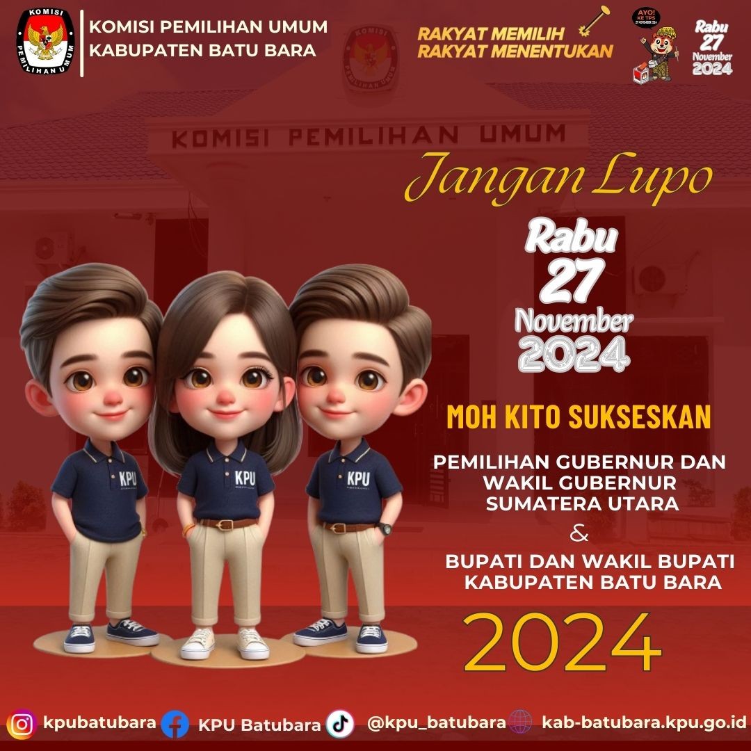 Jangan Lupo, Rabu, 27 November 2024, Moh kito sukseskan Pemilihan Gubernur dan Wakil Gubernur Sumatera Utara serta Bupati dan Wakil Bupati Kabupaten Batu Bara. Jangan lupo datang ke TPS yo.