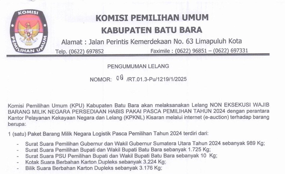 Berikut kami umumkan Pengumuman No: 1/RT.01.3-Pu/1219/1/2025 terkait lelang non eksekusi Wajib Barang Milik Negara Persediaan Barang Habis Pakai Eks Pemilihan Umum Tahun 2024.