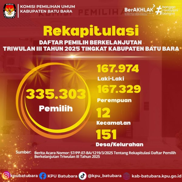 Berikut kami sampaikan Infografis terkait Rekapitulasi Daftar pemilih Berkelanjutan Triwulan III Tahun 2025 Tingkat Kabupaten Batu Bara. Selengkapnya yuk cek pada postingan diatas ya.