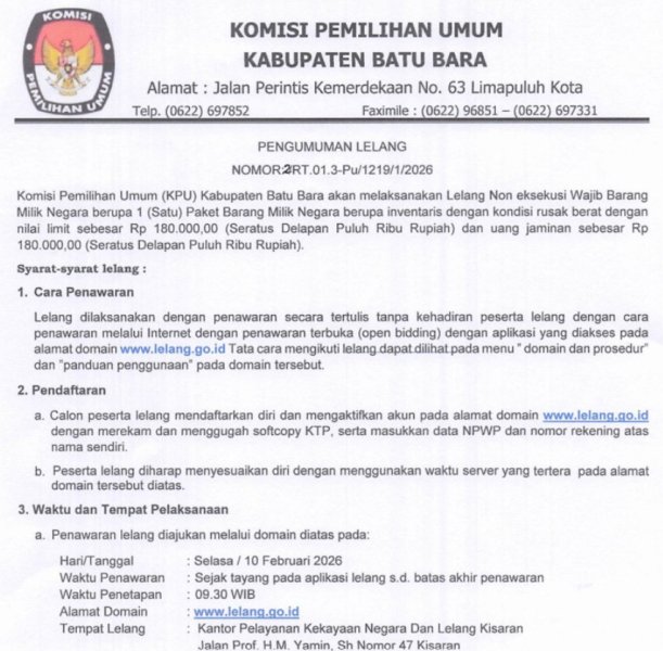 Berikut kami sampaikan Pengumuman Lelang Nomor: 2/RT.01.3-Pu/1219/1/2026. Komisi Pemilihan Umum (KPU) Kabupaten Batu Bara akan melaksanakan lelang Non Eksekusi Wajib Barang Milik Negara berupa 1 (Satu) Paket Barang Milik Negara berupa inventaris dengan kondisi rusak berat dengan nilai limit sebesar Rp 180.000,00 (seratus Delapan Puluh Ribu Rupiah) dan uang jaminan sebesar Rp 180.000,00 (Seratus Delapan Puluh Ribu Rupiah).