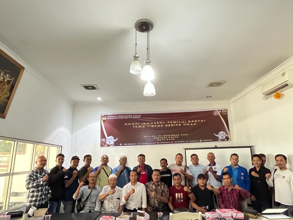 KPU Batu Bara- Bertempat di Aula Partner Coffee, Jalan Lintas Sumatera Lima Puluh, Batu Bara, Komisi Pemilihan Umum Batu Bara melaksanakan kegiatan Ngopi (Ngobrol Pemilu) Santai Dengan Tema “Stop Berita Hoax” dalam menghadapi Pemilihan Umum Tahun 2024, Selasa (05/12/23) Kegiatan yang dimulai pada pukul 08.00 WIB ini dibuka secara langsung oleh Plh. Ketua Komisi Pemilihan Umum Kabupaten Batu Bara, Husnul Zen. Dalam sambutan sekaligus membuka acara pada hari ini, Husnul Zen menjelaskan terkait tahapan yang sedang berlangsung pada saat ini dan menjelaskan pula terkait beberapa informasi terkait pendidikan pemilih seperti, Hari dan Tanggal Pemungutan Suara, Jenis- Jenis Surat suara yang digunakan pada Pemilu Tahun 2024 serta terkait Jumlah DPT di Kabupaten Batu Bara. Acara ini juga dihadiri oleh Tim Sekretariat KPU Kabupaten Batu Bara dan Peserta pada Kegiatan ini berasal dari Berbagai Media atau Jurnalis yang ada di Kabupaten Batu Bara. Hadir pula sebagai narasumber pada kegiatan ini, ketua PWI Kabupaten Batu Bara, Mhd. Dian Safei, S.Sos yang membawakan materi terkait Peran Pers dalam Menyukseskan Pemilu Tahun 2024. Kegiatan ini berjalan dengan tertib dan lancar, dan pada akhir kegiatan dilaksanakan foto bersama sebagai dokumentasi kegiatan. (WT)