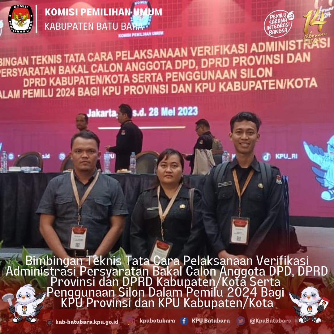 Bertempat di Hotel Grand Sahid Jaya, Jakarta, 26 s.d 28 Mei 2023 KPU Kabupaten Batu Bara mengikuti kegiatan Bimbingan Teknis Tata Cara Pelaksanaan Verifikasi Administrasi Persyaratan Bakal Calon Anggota DPD, DPRD Provinsi dan DPRD Kabupaten/Kota dan Penggunaan Silon.