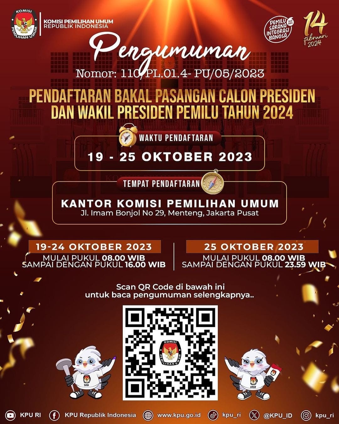 Kamu perlu tahu, Pendaftaran Bakal Pasangan Calon Presiden dan Wakil Presiden Pemilu Tahun 2024 dibuka dari tanggal 19 sd 25 Oktober 2023 di Kantor Komisi Pemilihan Umum. Simak selengkapnya melalui scan barcode ini...