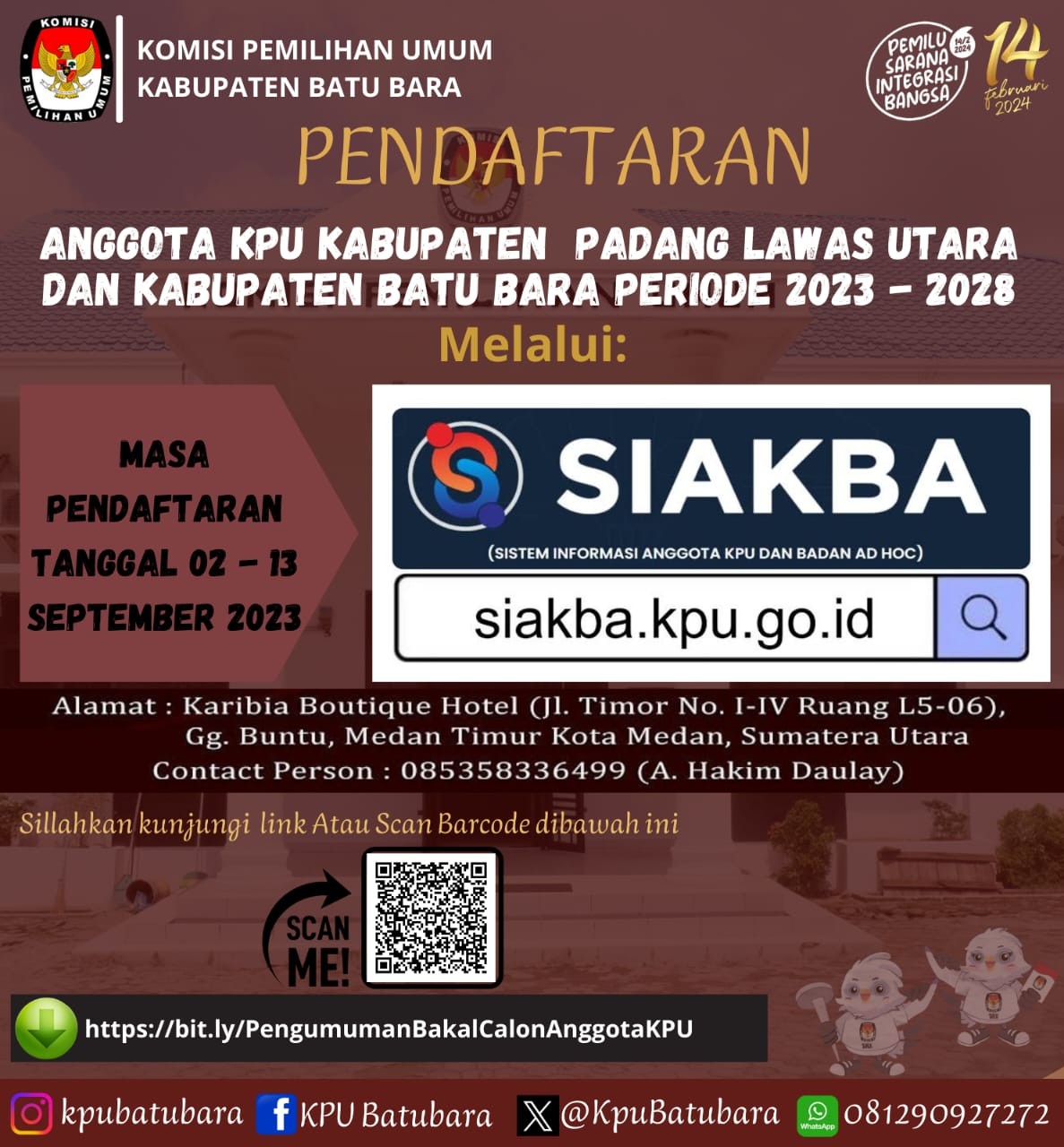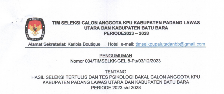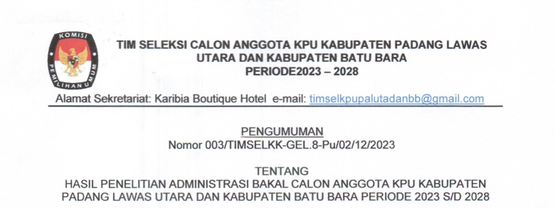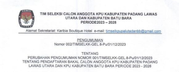 Berikut kami sampaikan Pengumuman Nomor: 002/TIMSELKK-GEL.8-Pu/01/12/2023 Tentang Perubahan Pengumuman Nomor 001/TIMSELKK-GEL.08-Pu/01/12/2023 Tentang Pendaftaran Bakal Calon Anggota KPU Kabupaten Padang Lawas Utara dan KPU Kabupaten Batu Bara Periode 2023-2028. Untuk Informasi selengkapnya #TemanPemilih dapat mengunduh pengumuman melalui link berikut: