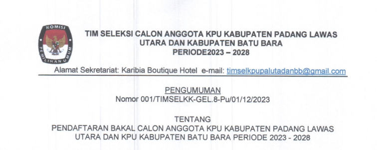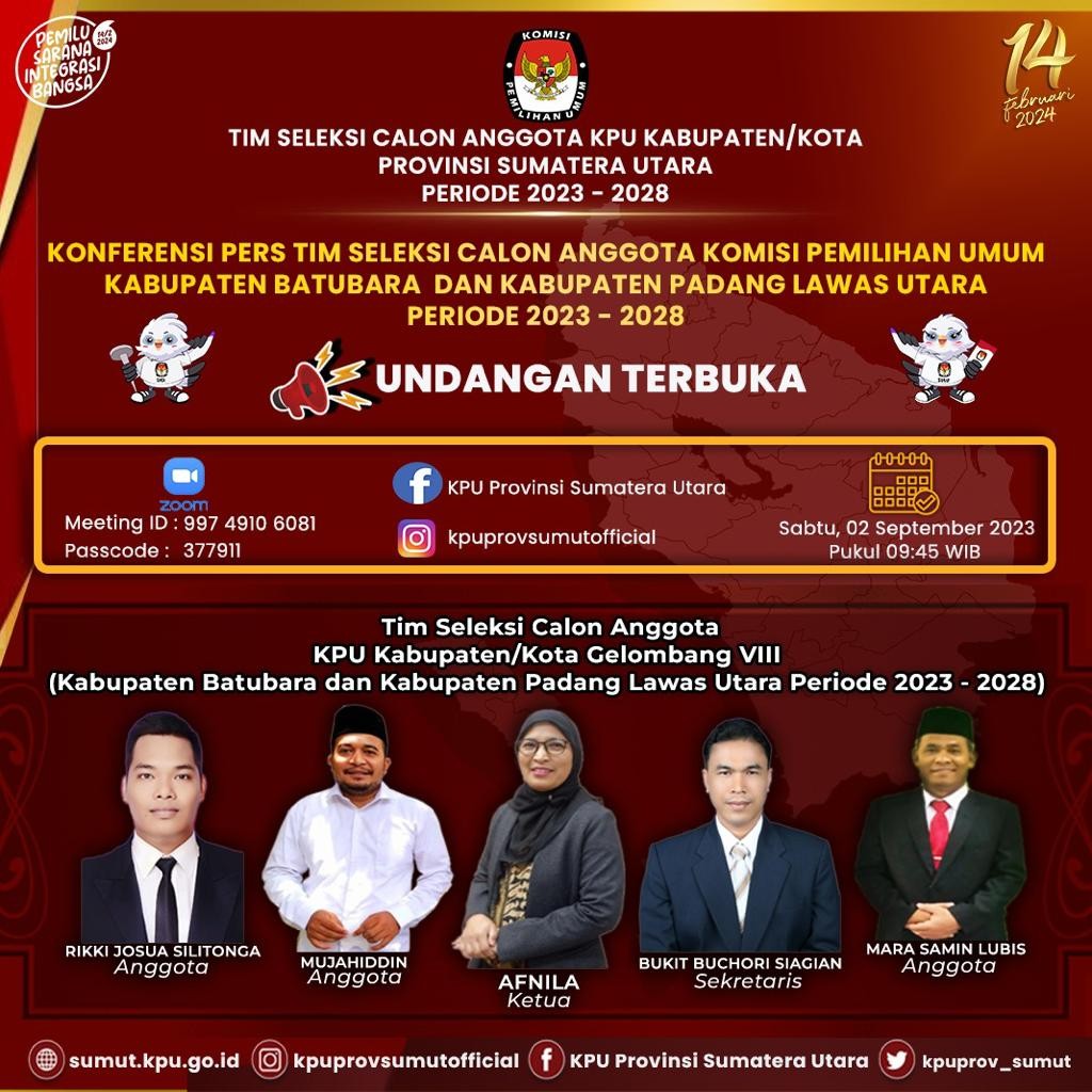 Berikut kami sampaikan Undangan terbuka terkait Konferensi Pers Tim Seleksi Calon Anggota KPU Kabupaten Batu Bara dan Kabupaten Padang Lawas Utara Periode 2023-2028 yang dilaksanakan pada Hari Sabtu, 02 September 2023 Pukul 09.45 WIB. #TemanPemilih bisa mengikuti acara ini melalui: