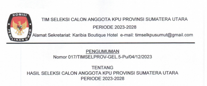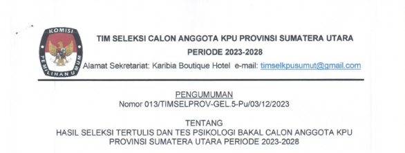Hai #TemanPemilih Berikut Kami Sampaikan Pengumuman Terkait Hasil Seleksi Tertulis dan Tes Psikologi Bakal Calon Anggota KPU Kabupaten/Kota di Provinsi Sumatera Utara. Untuk pengumuman selengkapnya dapat dilihat melalui link dibawah ini: Untuk Sumut 1 (KPU Kabupaten Asahan, KPU Kabupaten Karo, KPU Kabupaten Simalungun dan KPU Kabupaten Pakpak Bharat) Download Pengumuman Sumut 1 Untuk Sumut 2 (KPU Kota Binjai, KPU Kota Pematang Siantar, KPU Kota Tanjung Balai dan KPU Kota Medan) Download Pengumuman Sumut 2 Untuk Sumut 3 (KPU Kabupaten Serdang Bedagai, KPU Kabupaten Humbang Hasundutan, KPU Kabupaten Samosir dan KPU Kabupaten Toba) Download Pengumuman Sumut 3 Untuk Sumut 4 ( KPU Kabupaten Mandailing Natal, KPU Kabupaten Tapanuli Selatan, KPU Kabupaten Tapanuli Tengah, KPU Kota Padang Sidempuan, dan KPU Kota Sibolga) Download Pengumuman Sumut 4 Untuk Sumut 5 (KPU Kabupaten Nias, KPU Kabupaten Nias Barat, KPU Kabupaten Nias Selatan, KPU Kabupaten Nias Utara dan KPU Kota Gunung Sitoli) Download Pengumuman Sumut 5 Untuk Sumut 6 (KPU Kota Tebing Tinggi, KPU Kabupaten Labuhan Batu, KPU Kabupaten Labuhan Batu Selatan, dan KPU Kabupaten Labuhan Batu Utara) Download Pengumuman Sumut 6 #KPUMelayani #PemiluSerentak2024