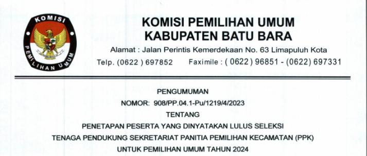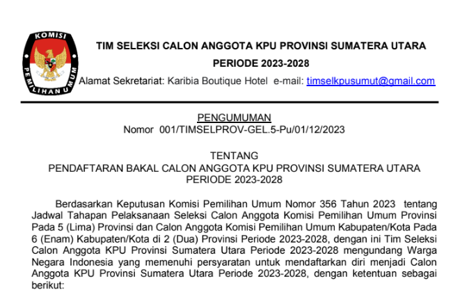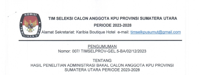 Berikut Kami Sampaikan Pengumuman Terkait Pendaftaran Bakal Calon Anggota Komisi Pemilihan Umum Kabupaten/Kota di Provinsi Sumatera Utara Periode Tahun 2023- 2028. Untuk pengumuman selengkapnya dapat dilihat melalui link dibawah ini: