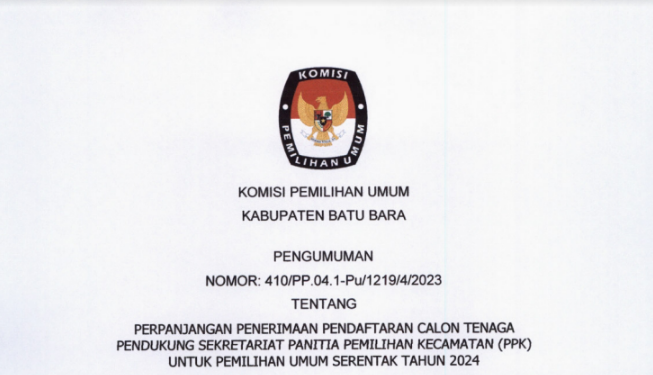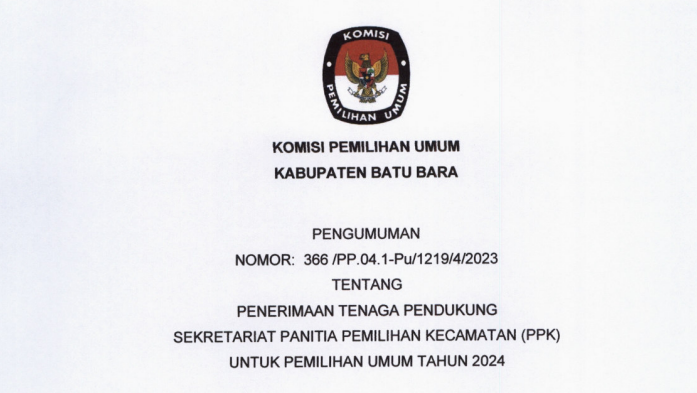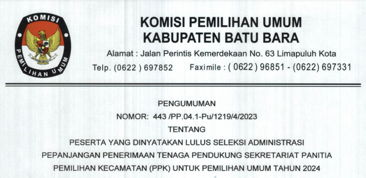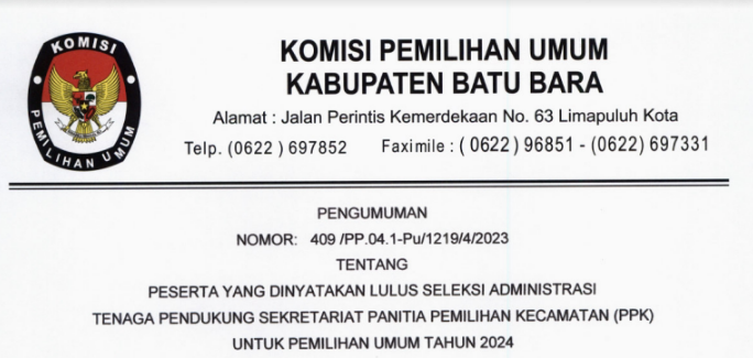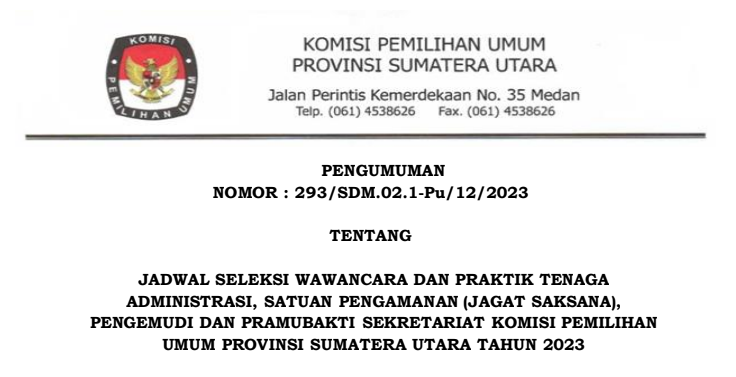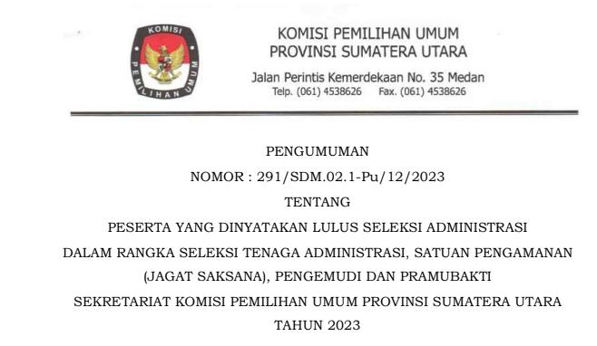 Berikut Kami Sampaikan Pengumuman Nomor 291/SDM.02.1-Pu/12/2023 Tentang Peserta yang Dinyatakan Lolos Seleksi Administrasi Dalam Rangka Seleksi Tenaga Administrasi , Satuan Pengamanan (Jagat Saksana), Pengemudi dan Pramubakti Sekretariat Komisi Pemilihan Umum Provinsi Sumatera Utara Tahun 2023