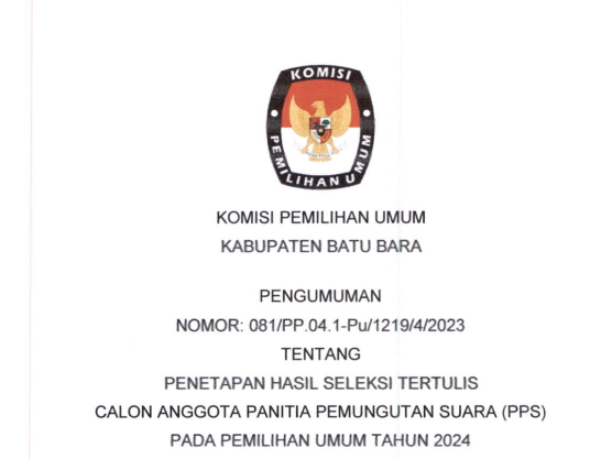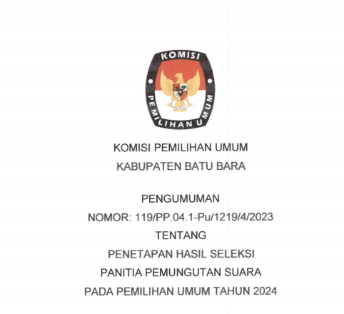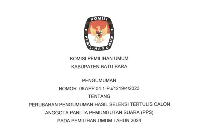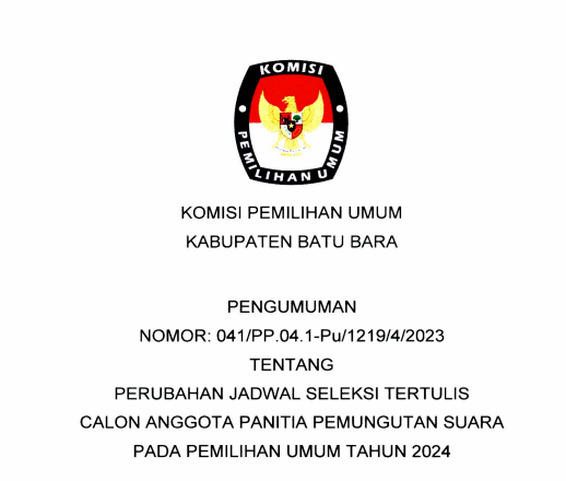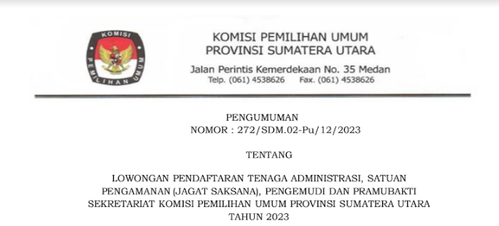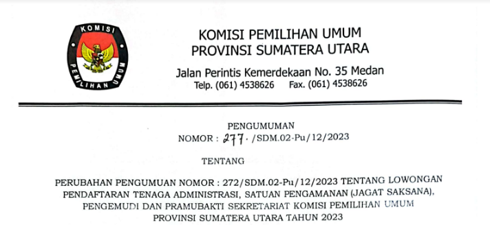 Berikut Kami Sampaikan Pengumuman Nomor 277/SDM.02-Pu/12/2023 Tentang Perubahan Pengumuman Nomor:272/SDM.02-Pu/12/2023 Tentang Lowongan Pendaftaran Tenaga Administrasi Satuan Pengamanan (Jagat Saksana), Pengemudi dan Pramubakti Sekretariat Komisi Pemilihan Umum Provinsi Sumatera Utara Tahun 2023.
