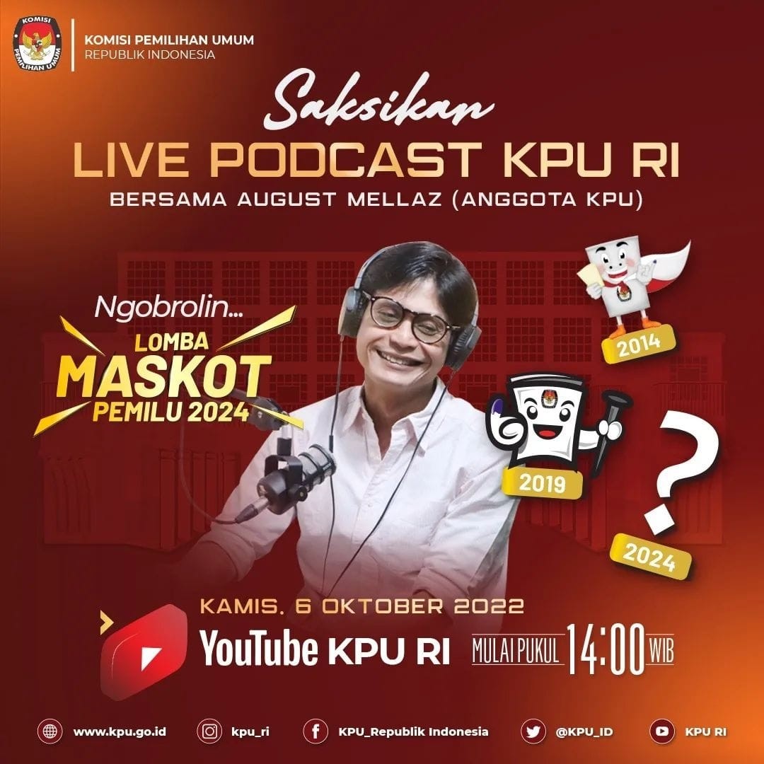 #TemanPemilih, yuk saksikan Live Podcast KPU RI bersama Anggota KPU August Mellaz, yang akan ngobrol tentang Lomba Maskot Pemilu 2024...!!