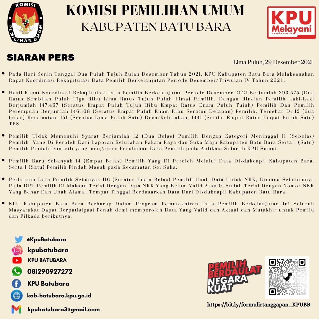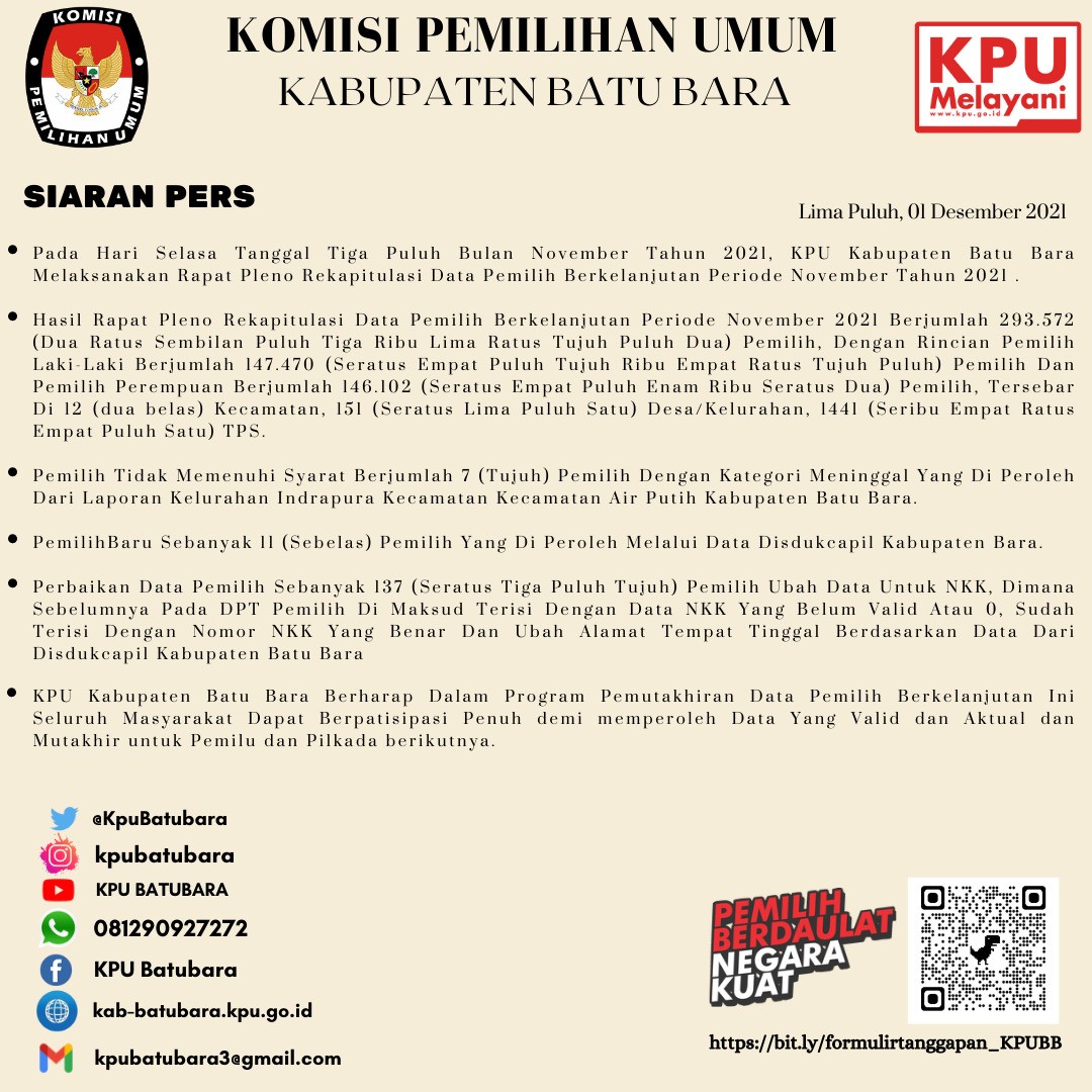 Hai #TemanPemilih Berikut kami sampaikan Siaran Pers Data Pemilih Berkelanjutan Periode Januari Tahun 2022. Rapat Pleno Rekapitulasi Data Pemilih Berkelanjutan ini dilaksanakan pada Hari Senin, 31 Januari 2022 di Aula Gedung Komisi Pemilihan Umum (KPU) Kabupaten Batu Bara. Adapun Hasil Rapat Pleno Rekapitulasi Data Pemilih Berkelanjutan Periode Januari Tahun 2022 berjumlah 293.600 (Dua Ratus Sembilan Puluh Tiga Ribu Enam Ratus) Pemilih, dengan rincian Pemilih Laki- Laki Berjumlah 147.470 (Seratus Empat Puluh Tujuh Ribu Empat Ratus Tujuh Puluh) Pemilih dan Pemilih Perempuan Berjumlah 146.130 (Seratus Empat Puluh Enam Ribu Seratus Tiga Puluh) Pemilih, tersebar di 12 (Dua Belas) Kecamatan, 151 (Seratus Lima Puluh Satu) Desa/Kelurahan, 1.441 (Seribu Empat Ratus Empat Puluh Satu) TPS Pemilih Tidak Memenuhi Syarat Berjumlah 13 (Tiga Belas) Pemiih dengan kategori, meninggal 8 (Delapan) Pemilih yang diperoleh dari laporan Kecamatan Sei Balai dan Kecamatan Datuk Lima Puluh, Kabupaten Batu Bara, serta 4 (Empat) Pemilih pindah keluar dan 1 (Satu) Pemilih bukan penduduk Desa Air Hitam Kecamatan Datuk Lima Puluh. Pemilih Pemula Sebanyak 36 (Tiga Puluh Enam) Pemilih yang diperoleh melalui Data Disdukcapil Kabupaten Batu Bara, serta 2 (Dua) Pemilih Pindah Masuk dari luar Kabupaten Batu Bara ke Kecamatan Sei Suka. Perbaikan Data Pemilih Sebanyak 101 (Seratus Satu) Pemilih ubah data untuk NKK, dimana sebelumnya pada DPT pemilih dimaksud terisi dengan NKK yang belum valid atau 0, sudah terisi dengan Nomor NKK yang benar dan ubah alamat tempat tinggal berdasarkan data dari Disdukcapil Kabupaten Batu Bara. KPU Kabupaten Batu Bara berharap dalam program pemutakhiran berkelanjutan ini seluruh masyarakat dapat berpartisipasi penuh demi memperoleh data yang valid, aktual dan mutakhir untuk Pemilu dan Pemilihan berikutnya *Untuk Mendowload Berita Acara Pleno Rekapitulasi Data Pemilih Berkelanjutan Periode Januari Tahun 2022 dapat melalui link di bawah ini: Download Berita Acara DPB Januari 2022