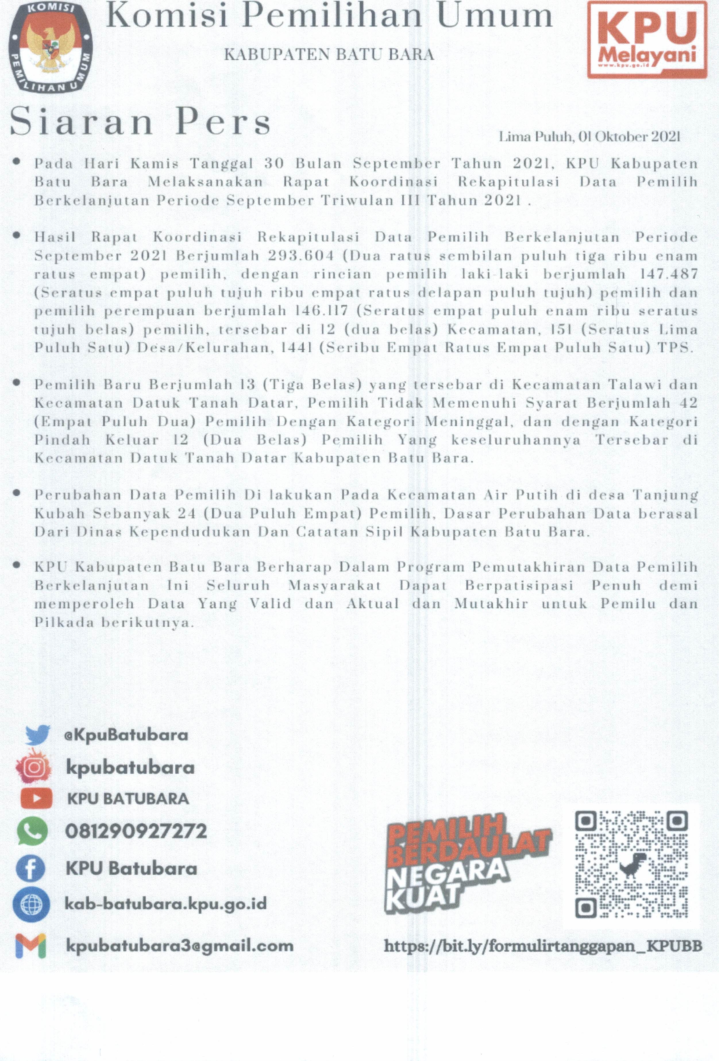 Siaran Pers DPB Triwulan III, Periode September 2021 Jumat, 01 Oktober 2021 00:00 696 Berikut Kami Sampaikan Siaran Pers DPB Triwulan III, Periode September 2021 KPU Kabupaten Batu Bara Baca Selengkapnya