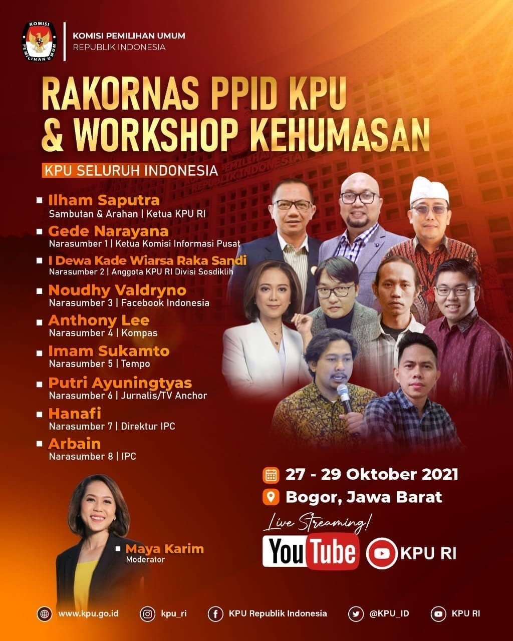 RAKORNAS PPID KPU & WORKSHOP KEHUMASAN Rabu, 27 Oktober 2021 00:00 692 Hai #TemanPemilih Ingin lebih jauh mengetahui seputar kepemiluan dan kehumasan di KPU??? Saksikan RAKORNAS PPID KPU & WORKSHOP KEHUMASAN mulai tanggal 27- 29 Oktober 2021 melalui kanal Youtube KPU Republik Indonesia. klik disini Baca Selengkapnya