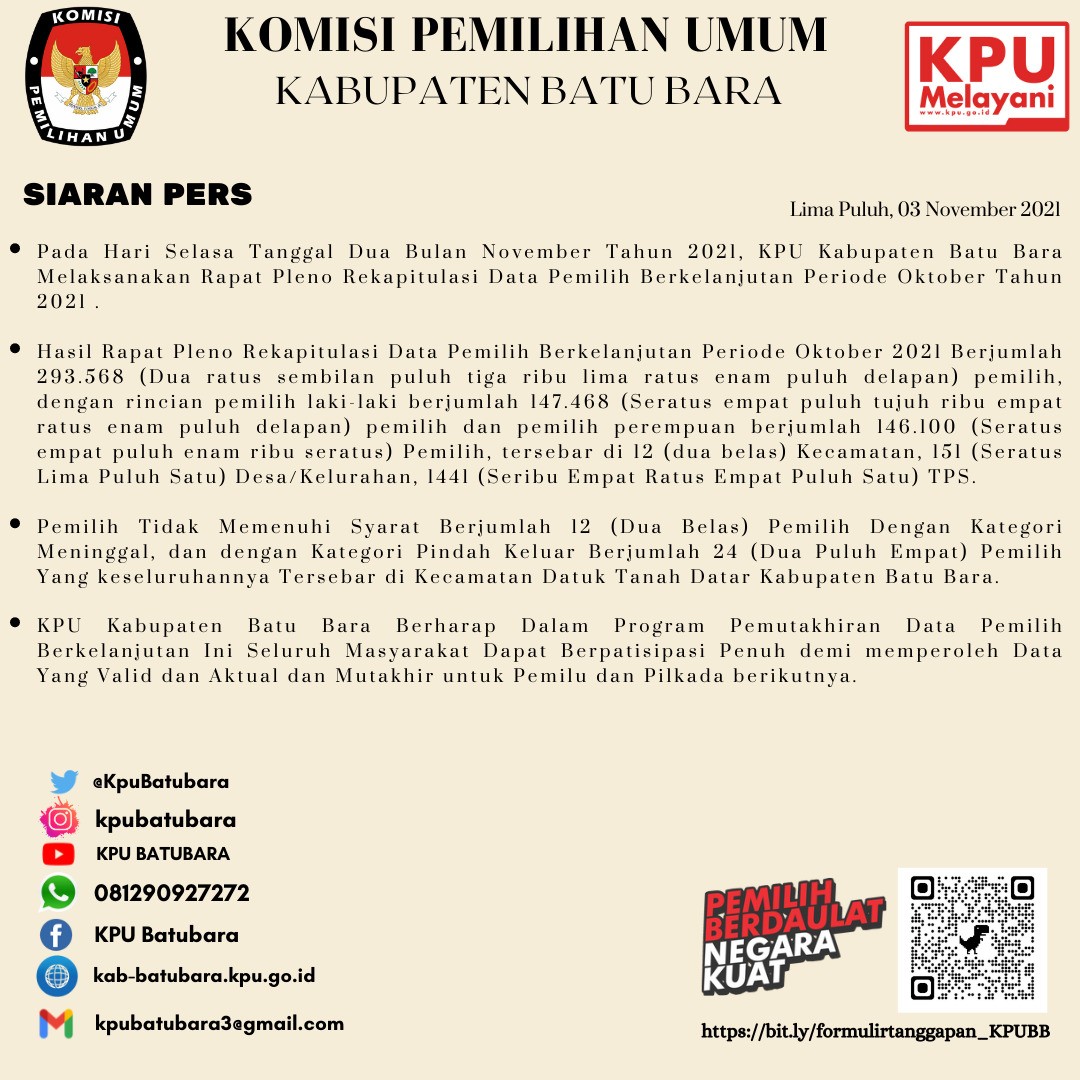 Siaran Pers Data Pemilih Berkelanjutan Periode Bulan Oktober Tahun 2021 Rabu, 03 November 2021 00:00 666 Hai #TemanPemilih Berikut kami sampaikan Siaran Pers Data Pemilih Berkelanjutan Periode Bulan Oktober Tahun 2021. Baca Selengkapnya