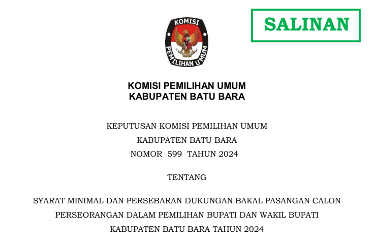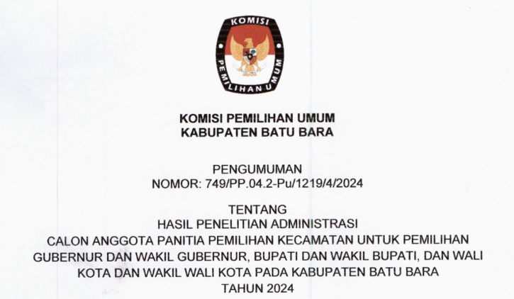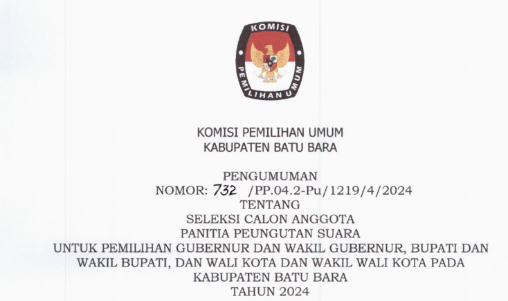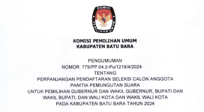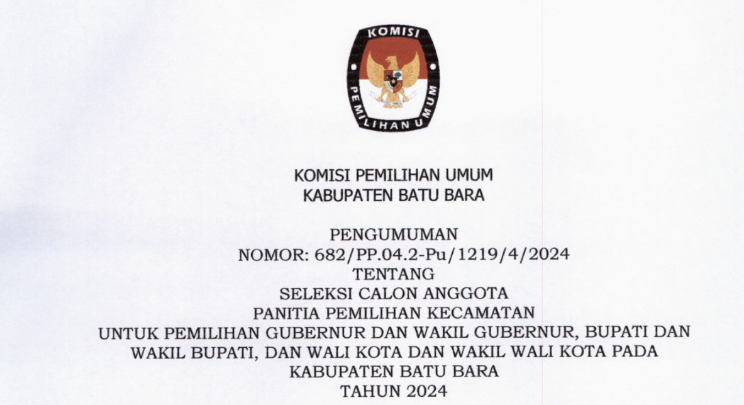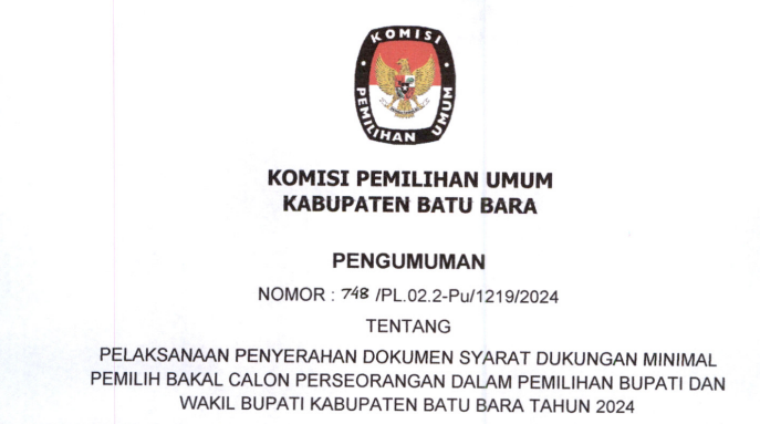 Berikut kami umumkan Pengumuman Nomor 748/PL.02.2-Pu/1219/2024 Tentang Pelaksanaan Penyerahan Dokumen Syarat Dukungan Minimal Pemilih Bakal Calon Perseorangan Dalam pemilihan Bupati dan wakil Bupati Kabupaten Batu Bara Tahun 2024. Untuk informasi selengkapnya #TemanPemilih dapat melihat dan mendownload pengumuman melalui link di bawah ini: