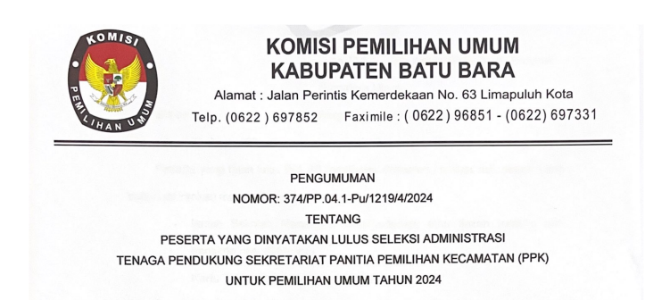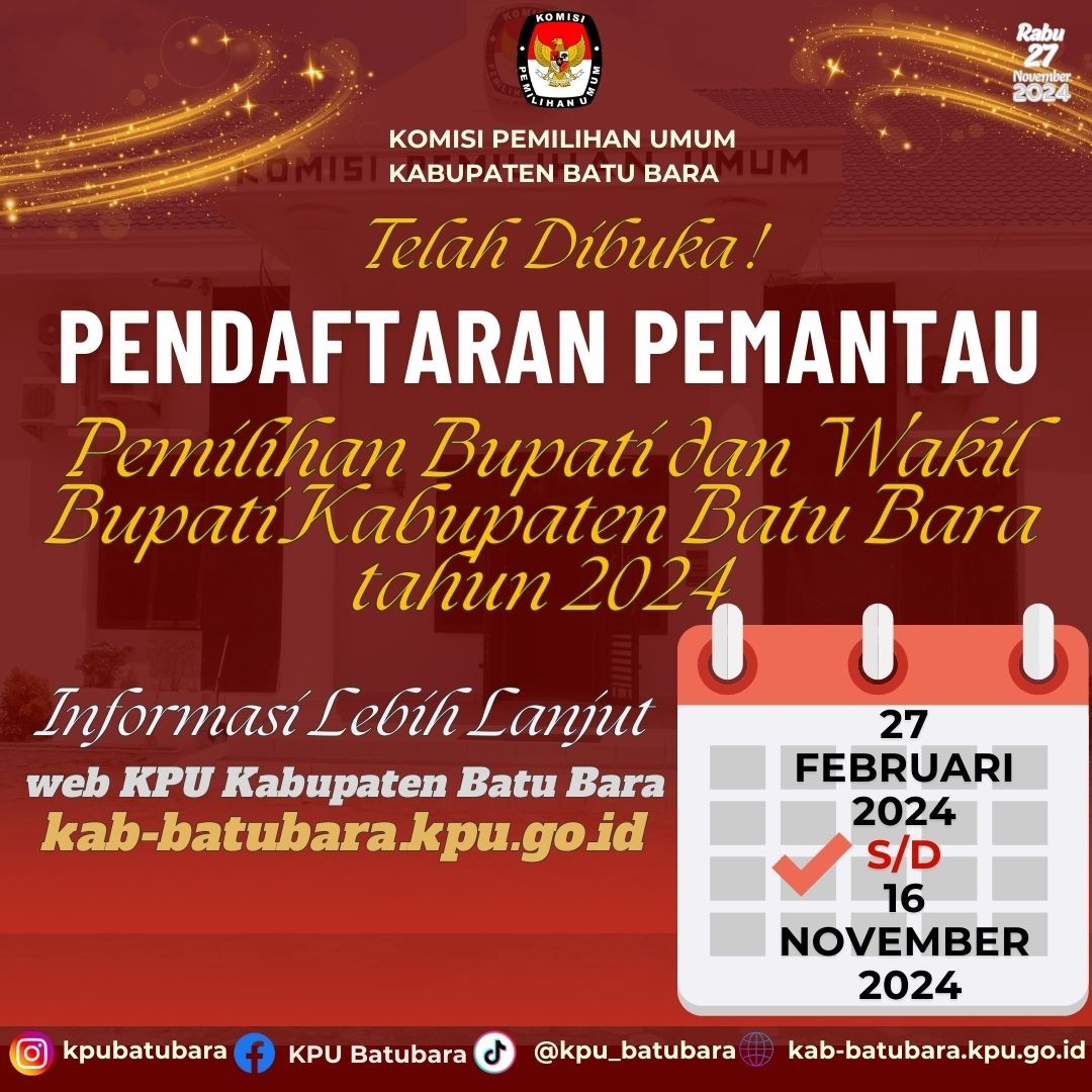 Berdasarkan Peraturan Komisi Pemilihan Umum Nomor 2 Tahun 2024 Tentang Tahapan dan Jadwal Pemilihan Gubernur dan Wakil Gubernur, Bupati dan Wakil Bupati Serta Walikota dan Wakil Walikota Tahun 2024, dengan ini Komisi Pemilihan Umum Kabupaten Batu Bara membuka Pendaftaran Pemantau Pemilihan Bupati dan Wakil Bupati Kabupaten Batu Bara Tahun 2024 dengan Ketentuan Sebagai Berikut: