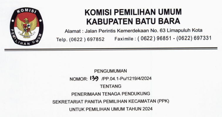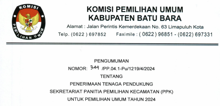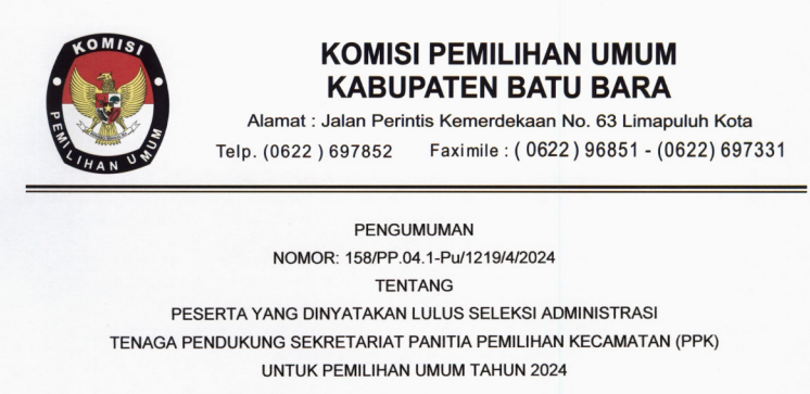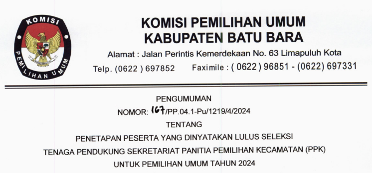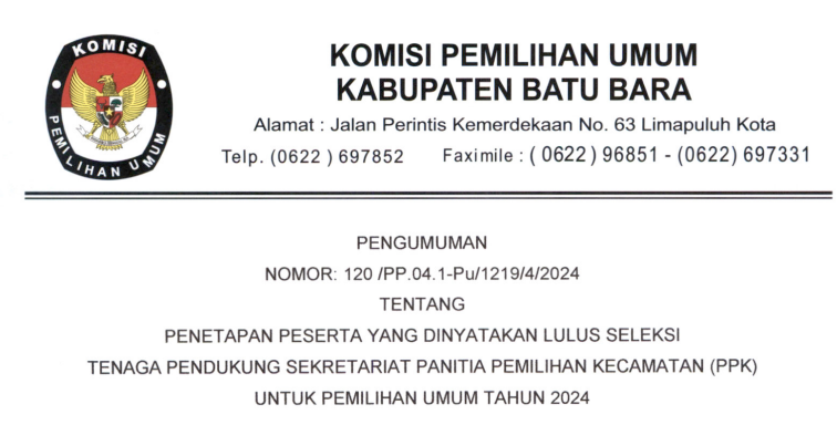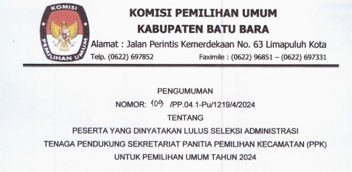 Berikut kami umumkan Pengumuman KPU Kabupaten Batu Bara Nomor: 120/PP.04.1-Pu/1219/4/2024 Tentang Penetapan Peserta Yang Dinyatakan Lulus Seleksi Tenaga pendukung Sekretariat Panitia Pemilihan Kecamatan (PPK) Untuk Pemilihan Umum Tahun 2024. Untuk pengumuman selengkapnya silahkan #TemanPemilih kunjungi atau download link di bawah ini: