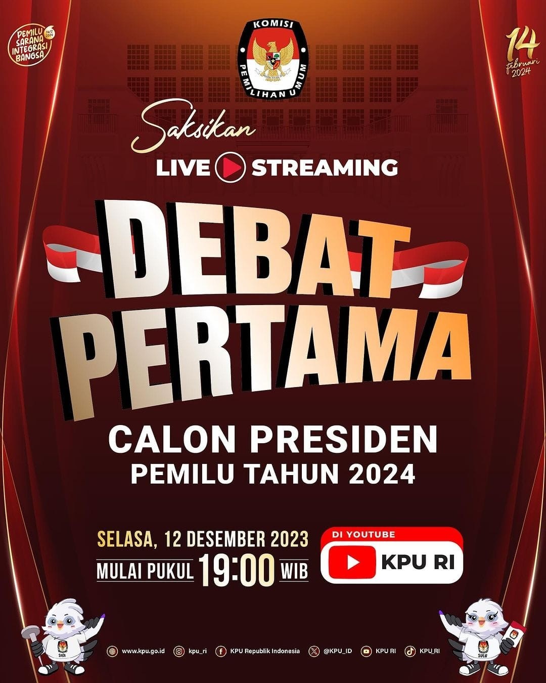 #TemanPemilih, saksikan Live Streaming Debat Pertama Calon Presiden Pemilu Tahun 2024, Hari Selasa, 12 Desember 2023 mulai pukul 19.00 WIB di kanal Youtube KPU RI. Jangan Sampai ketinggalan yaa ? #KPUMelayani #PemiluSerentak2024