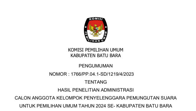 Berikut kami umumkan Pengumuman Nomor: 1766/PP.04.1-SD/1219/4/2023 Tentang Hasil Penelitian Administrasi Calon Anggota Kelompok Penyelenggara Pemungutan Suara Untuk Pemilihan Umum Tahun 2024 se- Kabupaten Batu Bara. Untuk pengumuman selengkapnya #TemanPemilih dapat melihat atau mendownload melalui link di bawah ini: