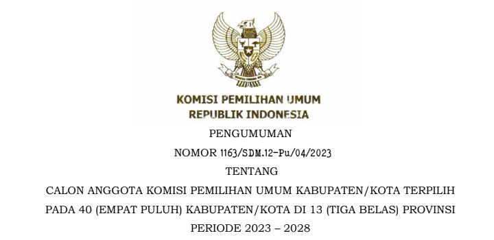 Berikut kami umumkan pengumuman Nomor:1163/SDM.12-Pu/04/2023 Tentang Calon Anggota Komisi Pemilihan Umum Kabupaten/Kota Terpilih Pada 40 (Empat Puluh) Kabupaten/Kota di 13 (Tiga Belas) Provinsi Periode 2023-2028. Untuk Pengumuman Selengkapnya Silahkan #TemanPemilih mendownload melalui link dibawah ini:
