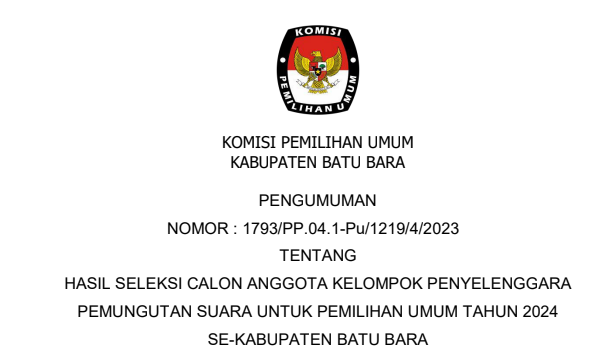 Berikut kami umumkan Pengumuman Nomor: 1793/PP.04.1-Pu/1219/4/2023 Tentang Hasil Seleksi Calon Anggota Kelompok Penyelenggara Pemungutan Suara Untuk Pemilihan Umum Tahun 2024 Se- Kabupaten Batu Bara. Untuk pengumuman selengkapnya #TemanPemilih dapat melihat atau mendownload melalui link dibawah ini: