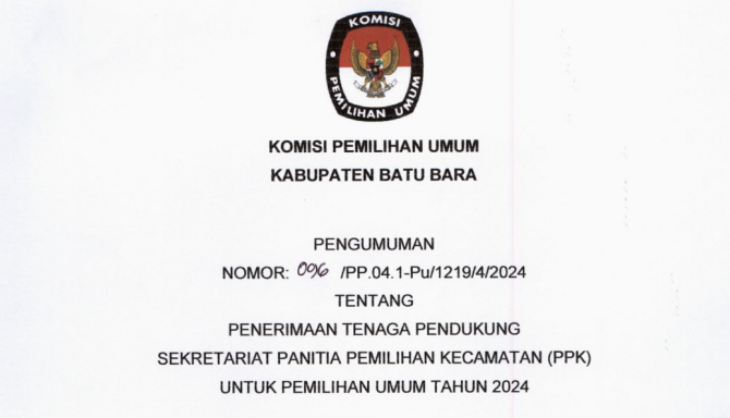 Berikut kami umumkan Pengumuman Nomor: 096/PP.04.1-Pu/1219/4/2024 Tentang Penerimaan Tenaga Pendukung Sekretariat Panitia Pemilihan Kecamatan (PPK) Untuk Pemilihan Umum Tahun 2024. Untuk pengumuman selengkapnya Ayo cek link dibawah ini: