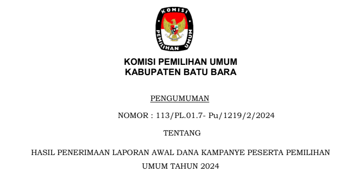 'Berikut Kami Umumkan Pengumuman Nomor: 113/PL.01.7-Pu/1219/2/2024 Tentang Hasil Penerimaan Laporan Awal Dana Kampanye Peserta Pemilihan Umum Tahun 2024. Untuk Informasi Selengkapnya silahkan #TemanPemilih klik link dibawah ini: